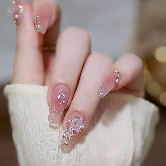 Designer: DuoDuo 1219.Handmade nails Press on Nails DIY Nail Art for woman girl Long Coffin pink wedding