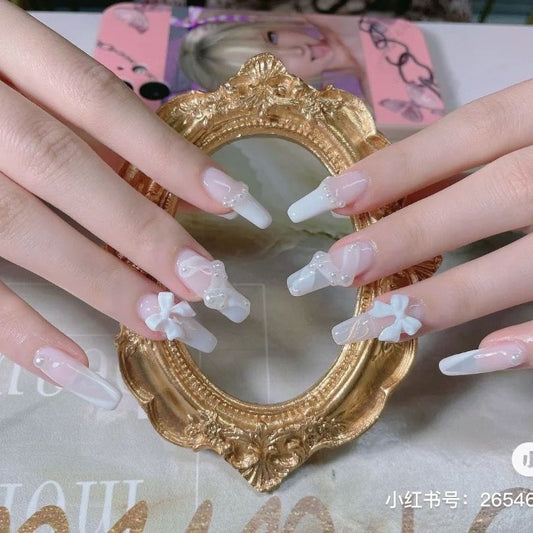 Designer: DuoDuo 3005.Handmade nails Press on Nails DIY Nail Art for woman girl French Long Coffin white wedding