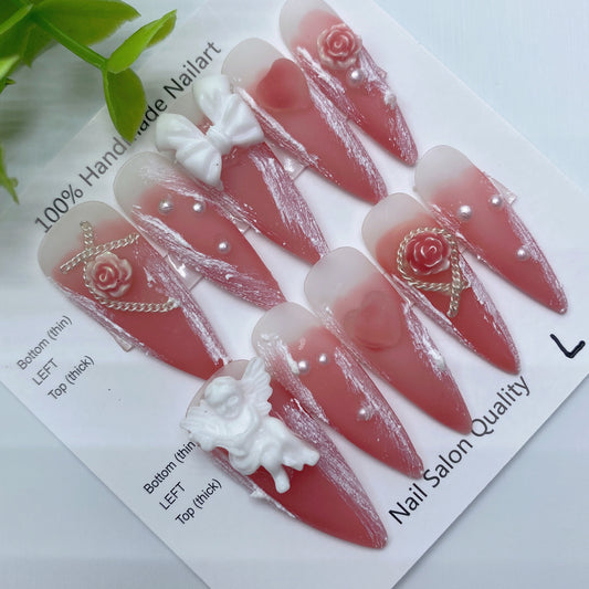 Designer: PinPin 3016.Handmade nails Press on Nails DIY Nail Art for woman girl Almond Long pink wedding