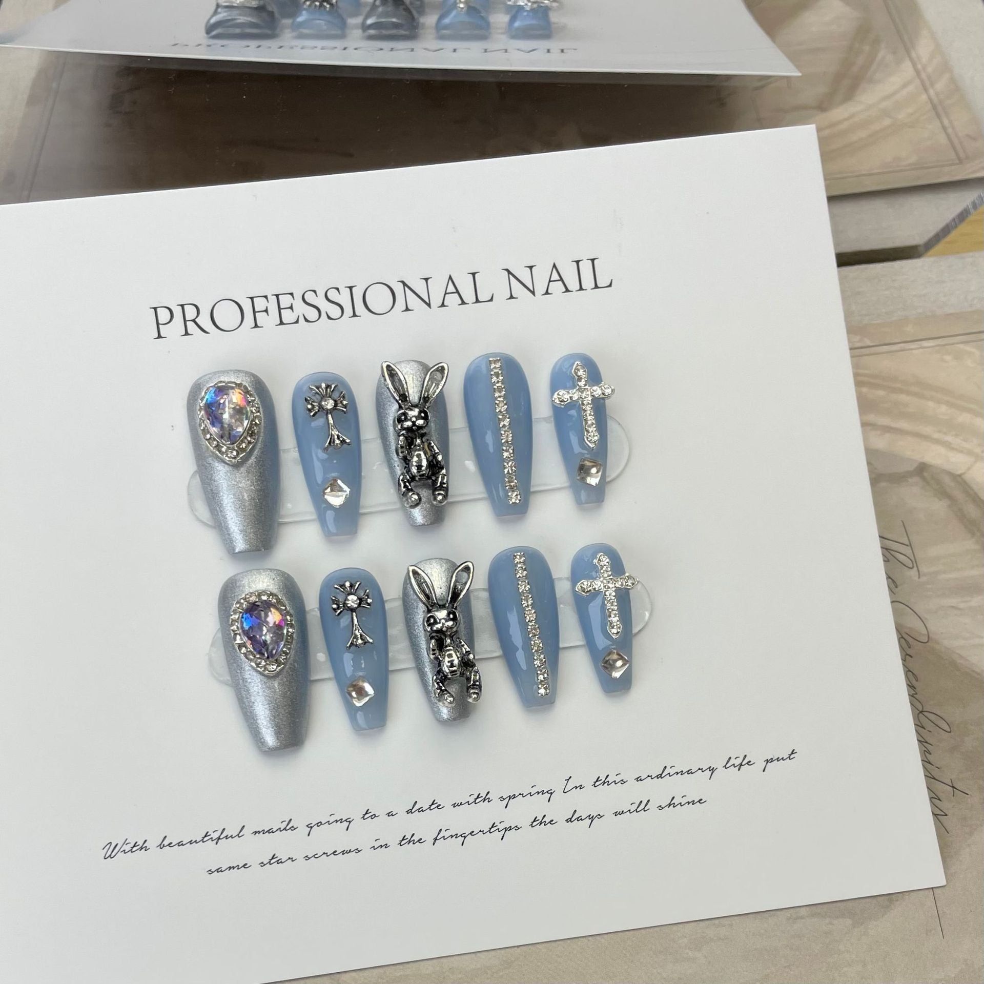 Designer: ManMan Handmade nails Press on Nails DIY Nail Art for woman girl Long Coffin blue